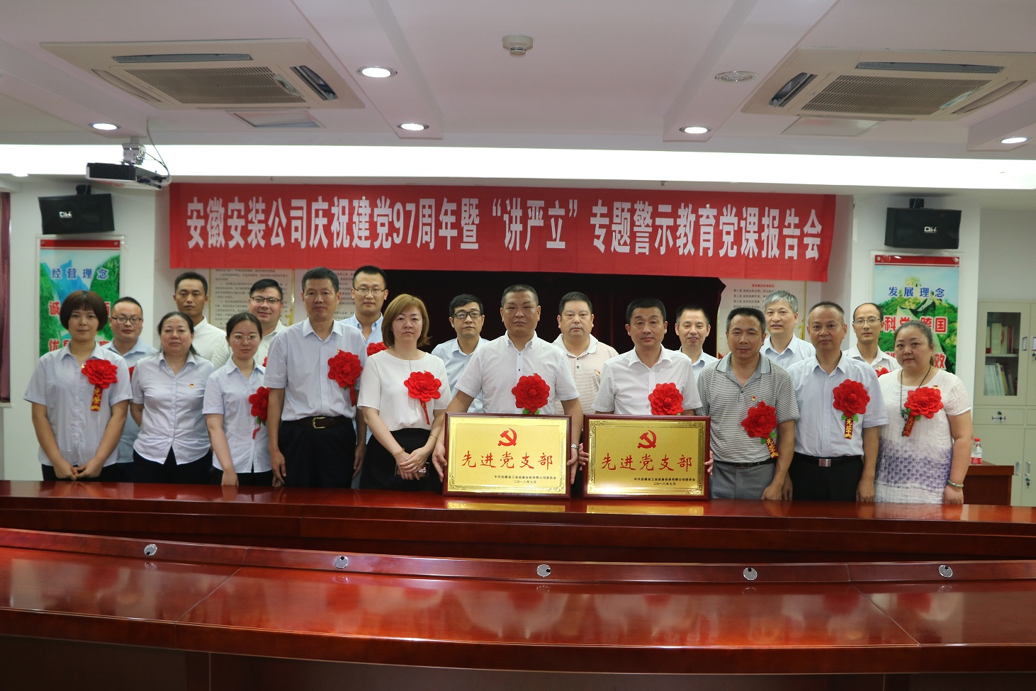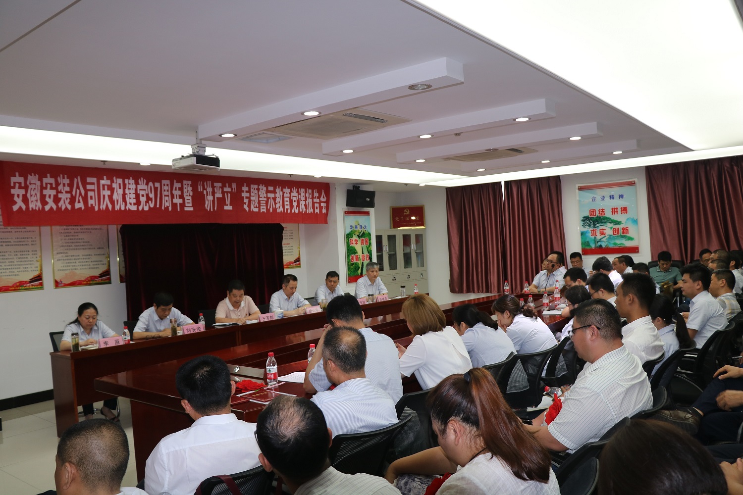 為慶祝中國共產黨建黨97周年,扎實開展好“講忠誠、嚴紀律、立政德”專題警示教育,推動全面從嚴治黨向縱深發展。7月4日下午,安徽安裝公司黨委召開慶祝建黨97周年暨“講嚴立”專題警示教育黨課報告會。公司黨委書記、副總經理胡六中作了題為《講忠誠 嚴紀律 立政德 做新時代合格共產黨員》的黨課報告。公司董事長、總經理、黨委副書記王軍邦主持會議并宣貫集團公司慶祝建黨97周年暨黨的建設工作會議精神。黨委委員、副總經理劉安俊宣讀表彰決定。公司領導班子成員、機關部門正副職、機關在崗黨員、分公司領導班子成員和受表彰的先進基層黨組織、優秀共產黨員和優秀黨務工作者共70余人參加會議。