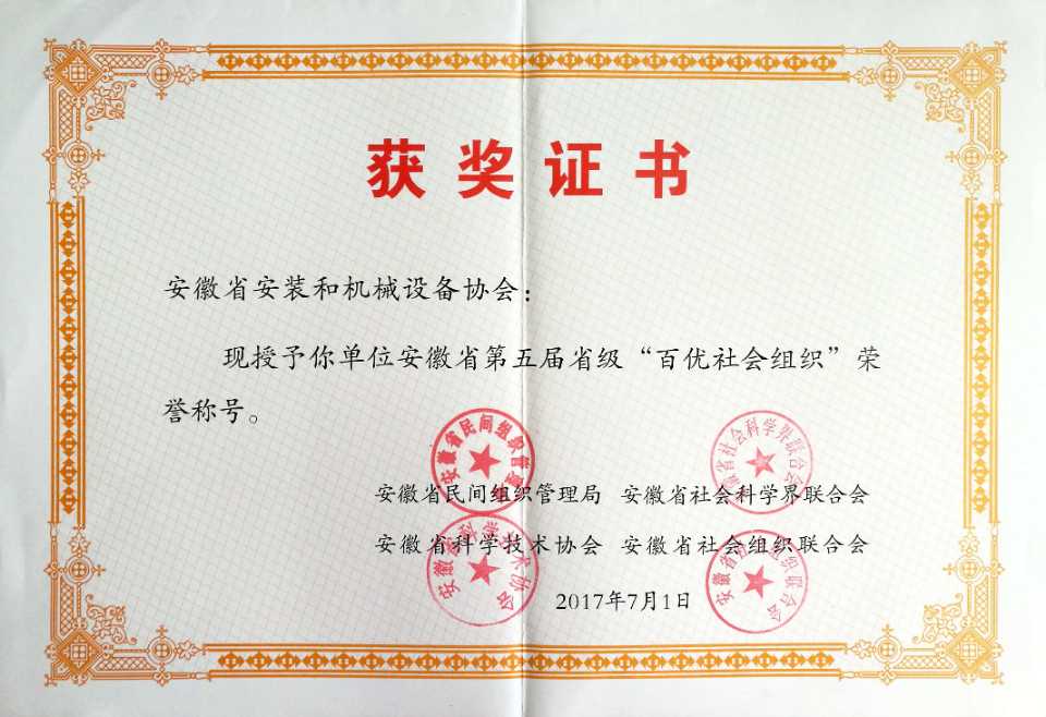 2017年7月,安徽省安裝和機(jī)械設(shè)備協(xié)會(huì)第三次榮獲安徽省第五屆省級(jí)“百優(yōu)社會(huì)組織”稱(chēng)號(hào),并由安徽省民間組織管理局、安徽省社會(huì)科學(xué)界聯(lián)合會(huì)、安徽省科學(xué)技術(shù)協(xié)會(huì)、安徽省社會(huì)組織聯(lián)合會(huì)聯(lián)合頒發(fā)了榮譽(yù)證書(shū)。