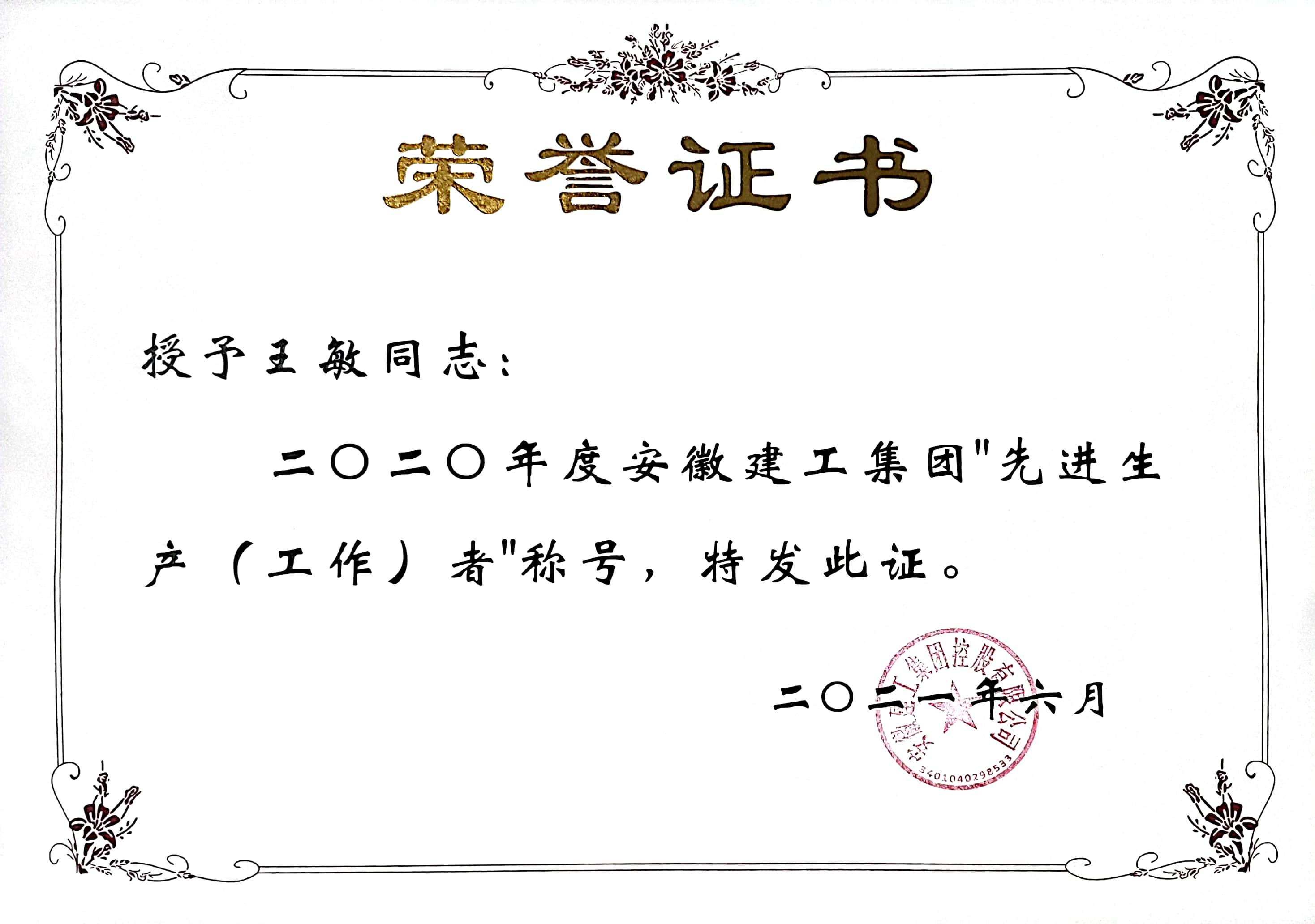 在工作作風(fēng)上,王敏一貫堅持對自己高標(biāo)準(zhǔn)嚴(yán)要求,腳踏實地,勤奮敬業(yè),認真細致,勤于思考,盡心盡責(zé),主動、積極地做好每一項工作,認真履行崗位職責(zé)。她時常告誡自己要以德服人,以身作則,并在實際工作中努力實踐著這一思想 ,注重自己的一言一行,公正、客觀,一切從大局出發(fā),不謀私利,不圖己便,廉潔自律,做到自重、自省、自警和自勵。2021年,王敏由于出色的工作成績,被評為“安徽建工集團2020年度先進生產(chǎn)(工作)者”,她說,這是集團對她過去工作的肯定,也是對她未來工作的要求。