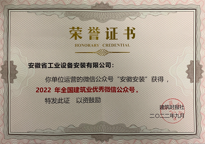 9月25日,由建筑時(shí)報(bào)社主辦的2022年建筑業(yè)微信公眾號(hào)運(yùn)維經(jīng)驗(yàn)交流研討會(huì)暨全國(guó)建筑業(yè)優(yōu)秀微信公眾號(hào)頒獎(jiǎng)典禮在武漢召開(kāi)。公司微信公眾號(hào)“安徽安裝”榮獲“2022年全國(guó)建筑業(yè)優(yōu)秀微信公眾號(hào)”榮譽(yù)。