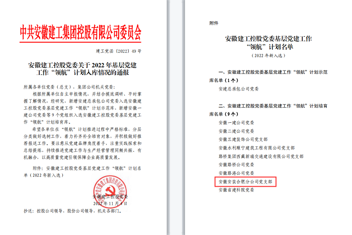 經(jīng)過前期充分準(zhǔn)備以及集團嚴(yán)格篩選研究,安徽安裝合肥分公司黨支部于近日成功入選集團基層黨建工作“領(lǐng)航”計劃培育庫。下一步,合肥分公司黨支部將以此為契機,注重實踐探索和總結(jié)提煉,大力開展黨建品牌建設(shè),并充分發(fā)揮榜樣示范作用,帶動更多的黨支部能有機會入選“領(lǐng)航”計劃培育庫,持續(xù)推進公司黨建工作與生產(chǎn)經(jīng)營管理同頻共振、有機融合,以高質(zhì)量黨建引領(lǐng)保障企業(yè)高質(zhì)量發(fā)展。