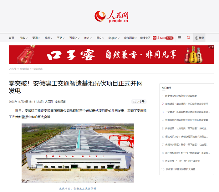 【名媒聚焦】人民網(wǎng):零突破!安徽建工交通智造基地光伏項目正式并網(wǎng)發(fā)電