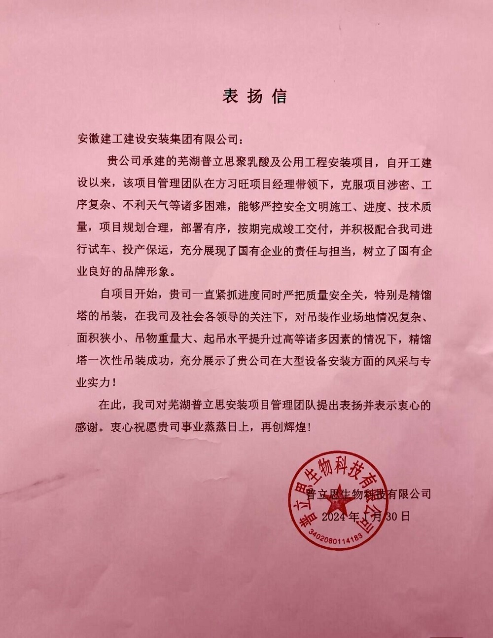 近日,建工安裝蕪湖普立思聚乳酸及公用工程安裝項目收到業主表揚信,對項目團隊在項目建設過程中主動作為、攻堅克難,敢于擔當、全力拼搏的精神予以充分肯定和高度認可,對公司及項目全體參建人員的辛苦付出和不懈努力表示衷心感謝和誠摯問候。