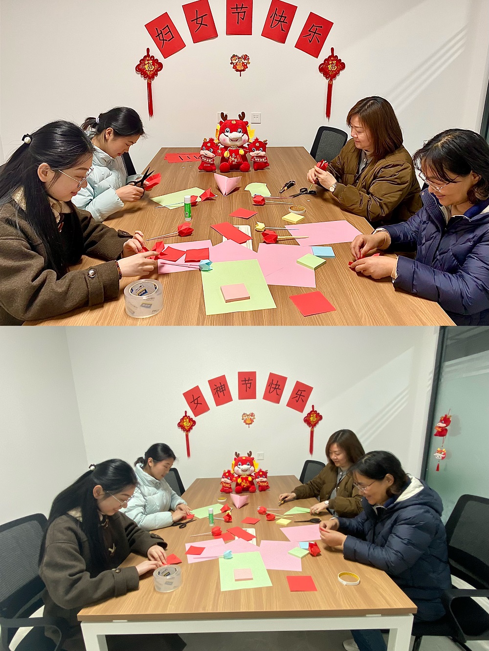 活動現(xiàn)場,首先映入女職工眼簾的是布置得非常溫馨的場景和滿桌的彩紙和折紙工具,女職工們圍坐一起相互傳授折疊方法和注意細節(jié),期間歡聲笑語,共同協(xié)作,最終在女職工的努力創(chuàng)作下,使一張張彩紙、一片片心意折疊成一朵朵栩栩如生、意喻著“體貼、高雅、富貴、能干、聰穎、博愛、永恒”的郁金香。