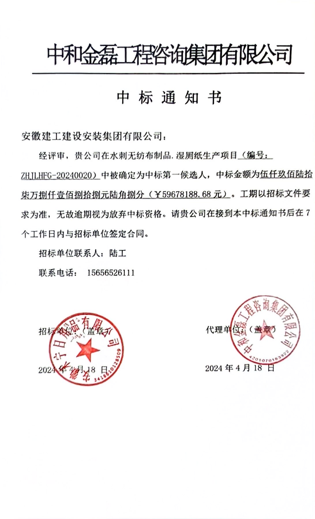 再傳喜訊!建工安裝蚌埠分公司中標安徽禾寧日用品有限公司水刺無紡布制品廠房建設項目,合計中標金額5968萬元。