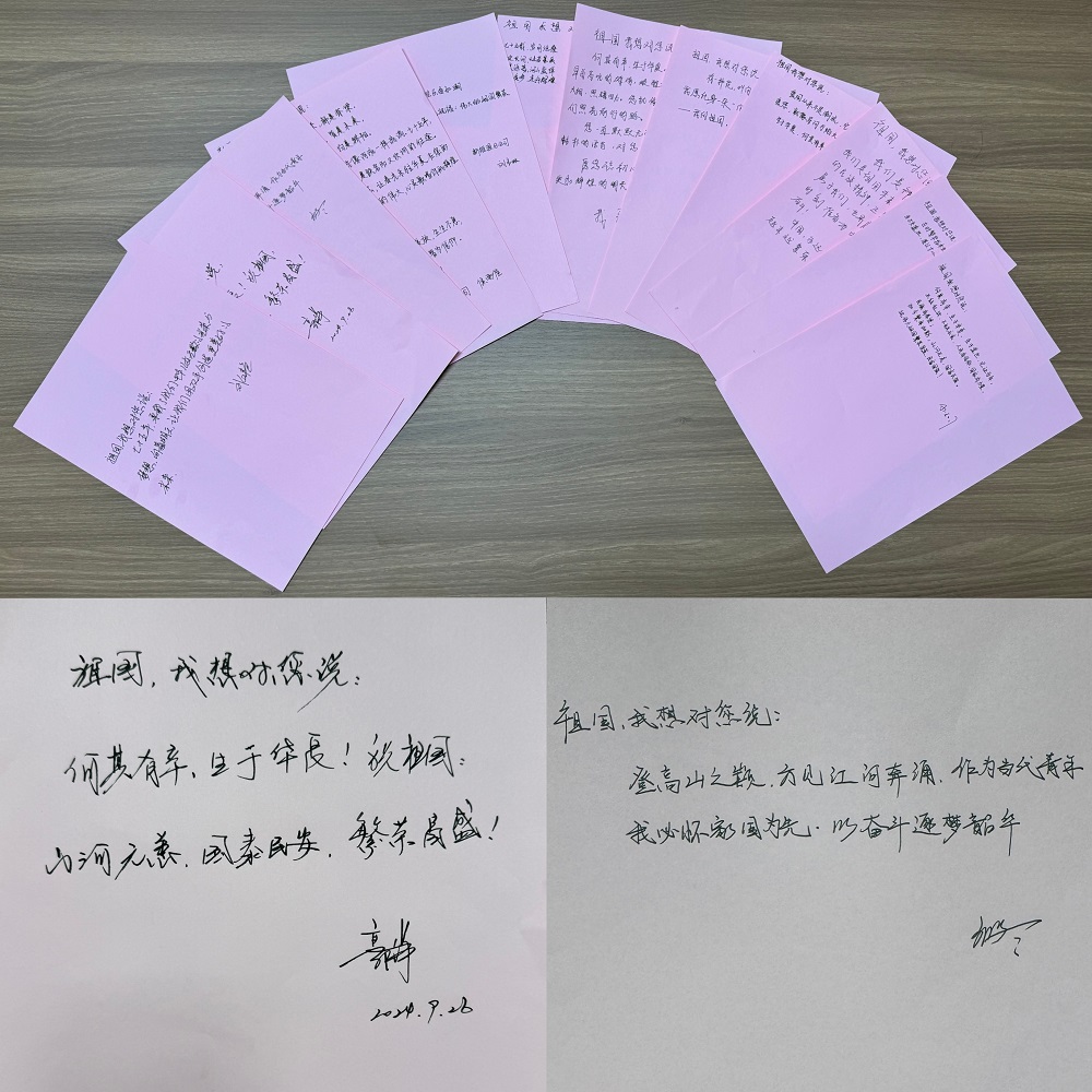 你看,這一句句真摯樸實的祝福,真情流露出我們對祖國的無比熱愛和深情告白:“七十五年,承載了我們中華兒女無數(shù)的光榮與夢想;向著明天,讓我們用雙手創(chuàng)造更美好的未來。”“有一種花,叫向日葵,永遠(yuǎn)向著太陽生長;此刻,我愿化身一朵“向日葵”,追隨我心中的“太陽”——我的祖國,祝您欣欣向榮、蒸蒸日上!”“我們是祖國未來的接班人,時刻準(zhǔn)備為中華民族的偉大騰飛而努力奮斗!”……
