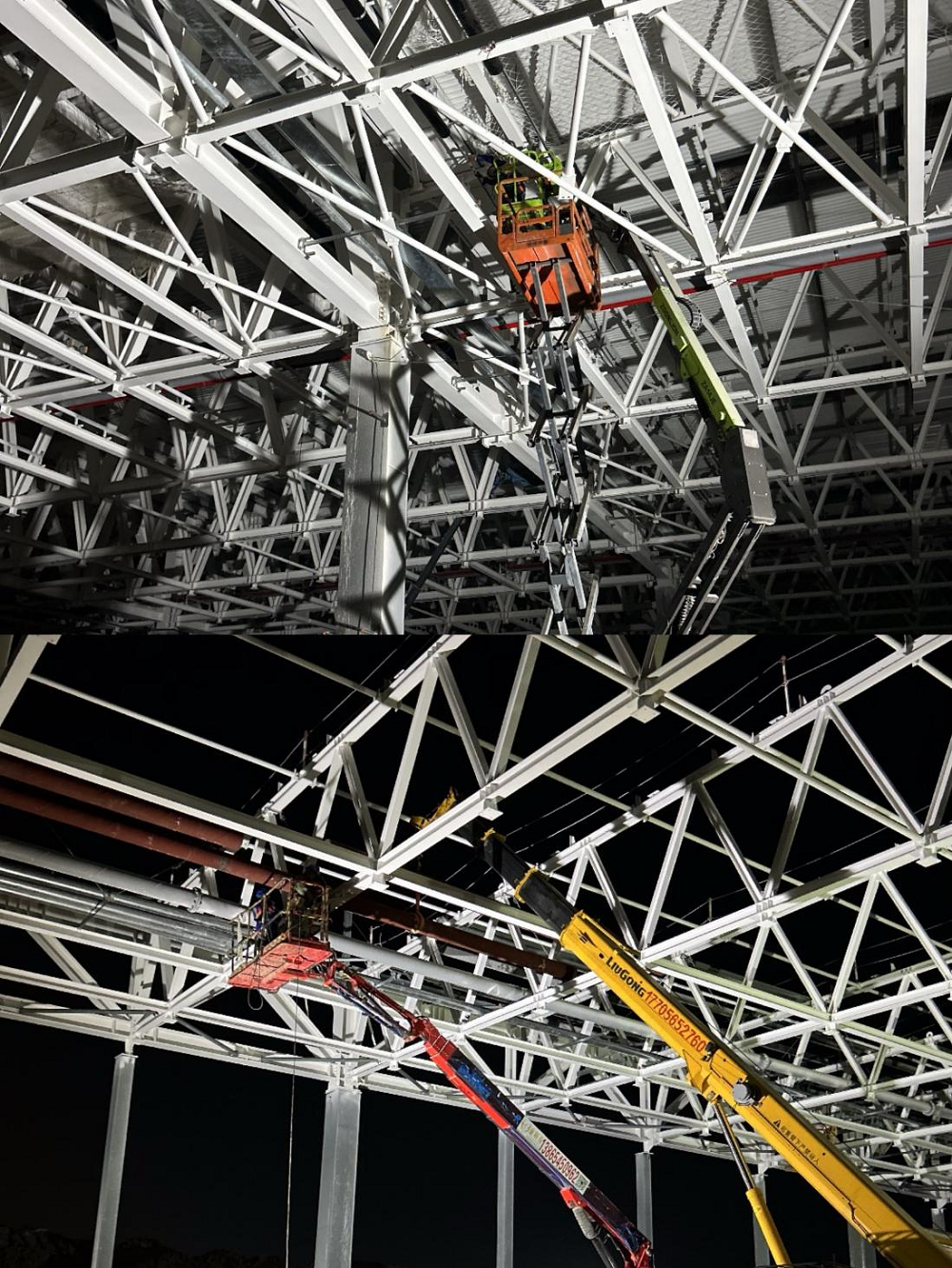 圖為合肥七水廠三期電安裝項目電纜溝支架刷漆、碳濾池管廊水沖管焊接