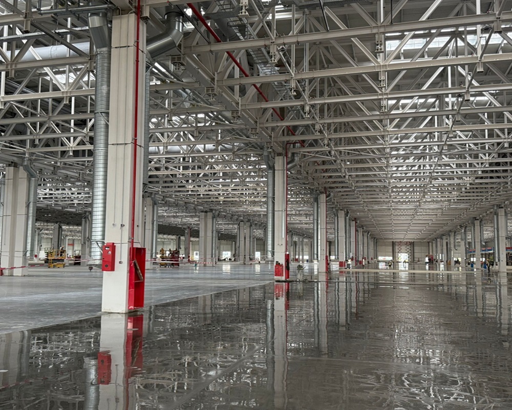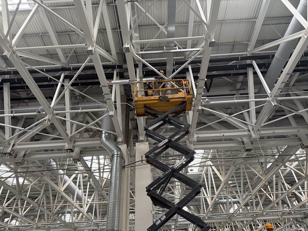 截至目前,焊裝車間燈具、車間一東側630毫米循環水不銹鋼管已全部安裝完成。本周完成消防箱安裝150套,母線安裝700米,屋頂風機設備吊裝到位,如期完成節點目標。與此同時,工藝廠家已進場同步施工。