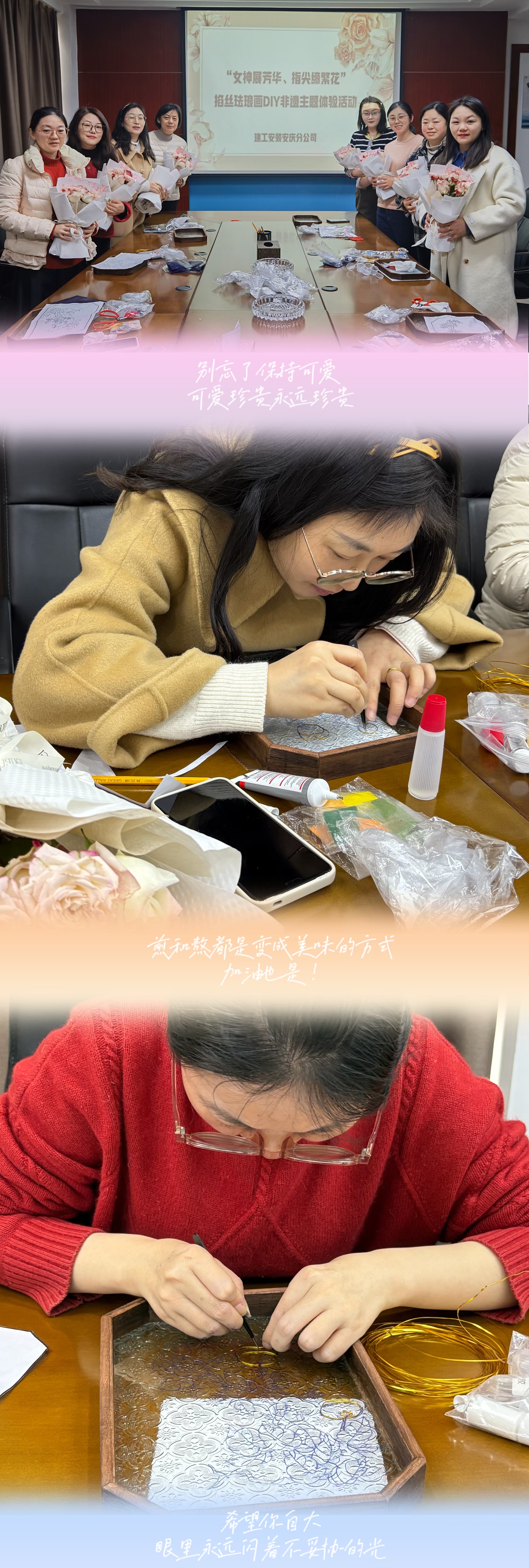 一年一度春風暖,如詩如畫三月天。在第115個“三八”國際勞動婦女節來臨之際,為豐富女職工的文化生活,激發女職工干事創業的工作熱情,增強女性職工歸屬感、幸福感,建工安裝安慶分公司于3月7日開展“女神展芳華、指尖締繁花”掐絲琺瑯畫DIY非遺主題體驗活動,讓大家感受傳統文化魅力和工匠精神。