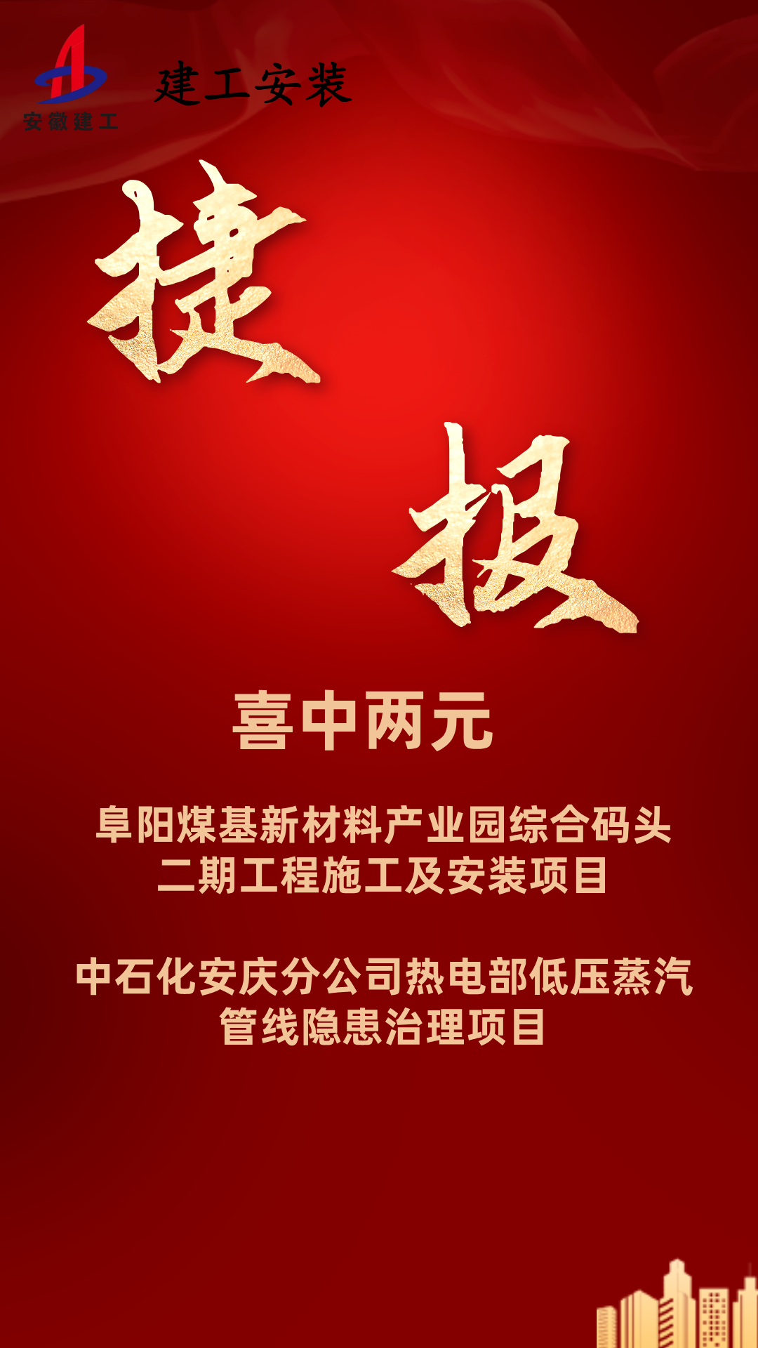近期,建工安裝喜中兩元,成功中標阜陽煤基新材料產業園綜合碼頭二期工程施工及安裝項目以及中石化安慶分公司熱電部低壓蒸汽管線隱患治理項目,中標總金額5400萬元。