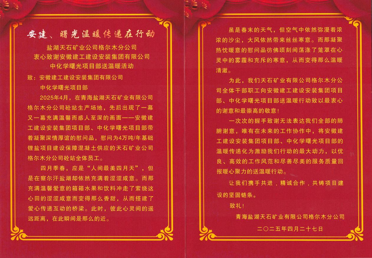 信中,青海鹽湖天石礦業有限公司格爾木分公司對建工安裝項目部此前慰問砼站全體員工致以最誠摯的感謝,愿繼續與建工安裝項目部攜手共進、精誠合作、再創佳績!這封感謝信不僅是對項目部過往成績的肯定,更是一份振奮人心的激勵。建工安裝將繼續保持高昂斗志和嚴謹態度,加強與相關單位溝通協作,強化項目管理,確保項目按期、高質量交付,為打造世界級鹽湖提鋰產業基地貢獻力量!